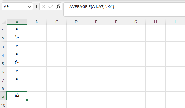 برای نمونه، در مثال زیر تابع AVERAGEIF (با استفاده از دو آرگومان) میانگین مقادیر موجود در محدودهی A1:A7 را که بزرگتر از صفر هستند محاسبه میکند:
