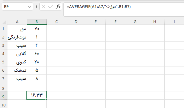 در این مثال، تابع AVERAGEIF میانگین مقادیر موجود در محدودهی B1:B7 را محاسبه میکند، اما تنها برای سطرهایی که سلول متناظر آنها در محدودهی A1:A7 مقداری غیر از عبارت “موز” داشته باشد: