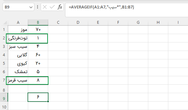در این مثال، تابع AVERAGEIF میانگین مقادیر موجود در محدودهی B1:B7 را محاسبه میکند، به شرط آنکه سلولهای متناظر در محدودهی A1:A7 شامل واژهی “سیب” همراه با هر تعداد کاراکتر دیگر (حتی بدون هیچ کاراکتر اضافی) باشند. در اکسل، علامت ستاره (*) بهعنوان کاراکتر عام (Wildcard) بهکار میرود و نشاندهندهی رشتهای با طول صفر یا بیشتر است:
