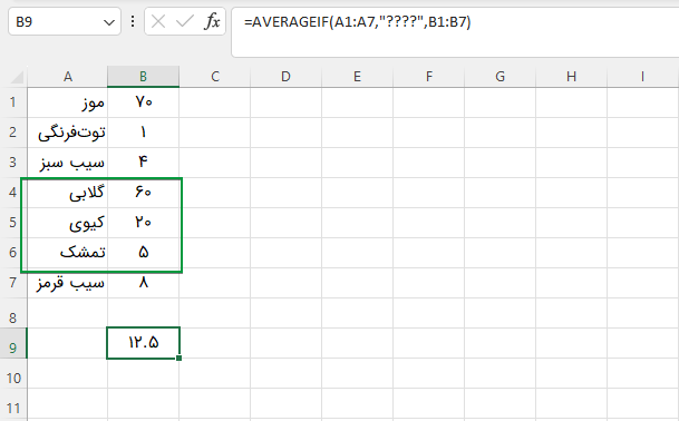در این مثال، تابع AVERAGEIF میانگین مقادیر موجود در محدودهی B1:B7 را محاسبه میکند، به این شرط که سلولهای متناظر در محدودهی A1:A7 دقیقاً شامل چهار کاراکتر باشند. در اکسل، علامت سؤال (?) بهعنوان یک کاراکتر عام (Wildcard) عمل میکند و نشاندهندهی دقیقاً یک کاراکتر است: