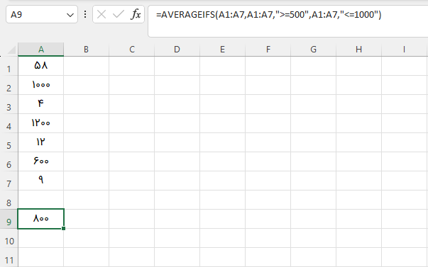 تابع AVERAGEIFS در اکسل (با حرف S در انتها) برای محاسبهی میانگین مقادیری بهکار میرود که بهطور همزمان چندین شرط مختلف را برآورده کنند. در مثال زیر، این تابع میانگین مقادیر موجود در محدودهی A1:A7 را تنها در صورتی محاسبه میکند که مقدار هر سلول بزرگتر یا مساوی 500 و همزمان کوچکتر یا مساوی 1000 باشد:
