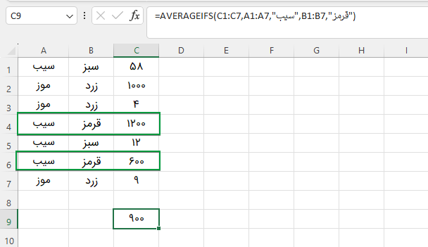 در مثال زیر، این تابع میانگین مقادیر موجود در محدودهی C1:C7 را فقط در صورتی محاسبه میکند که سلولهای متناظر در محدودهی A1:A7 دقیقاً حاوی عبارت “سیب” باشند و سلولهای متناظر در محدودهی B1:B7 نیز دقیقاً برابر با عبارت “قرمز” باشند: