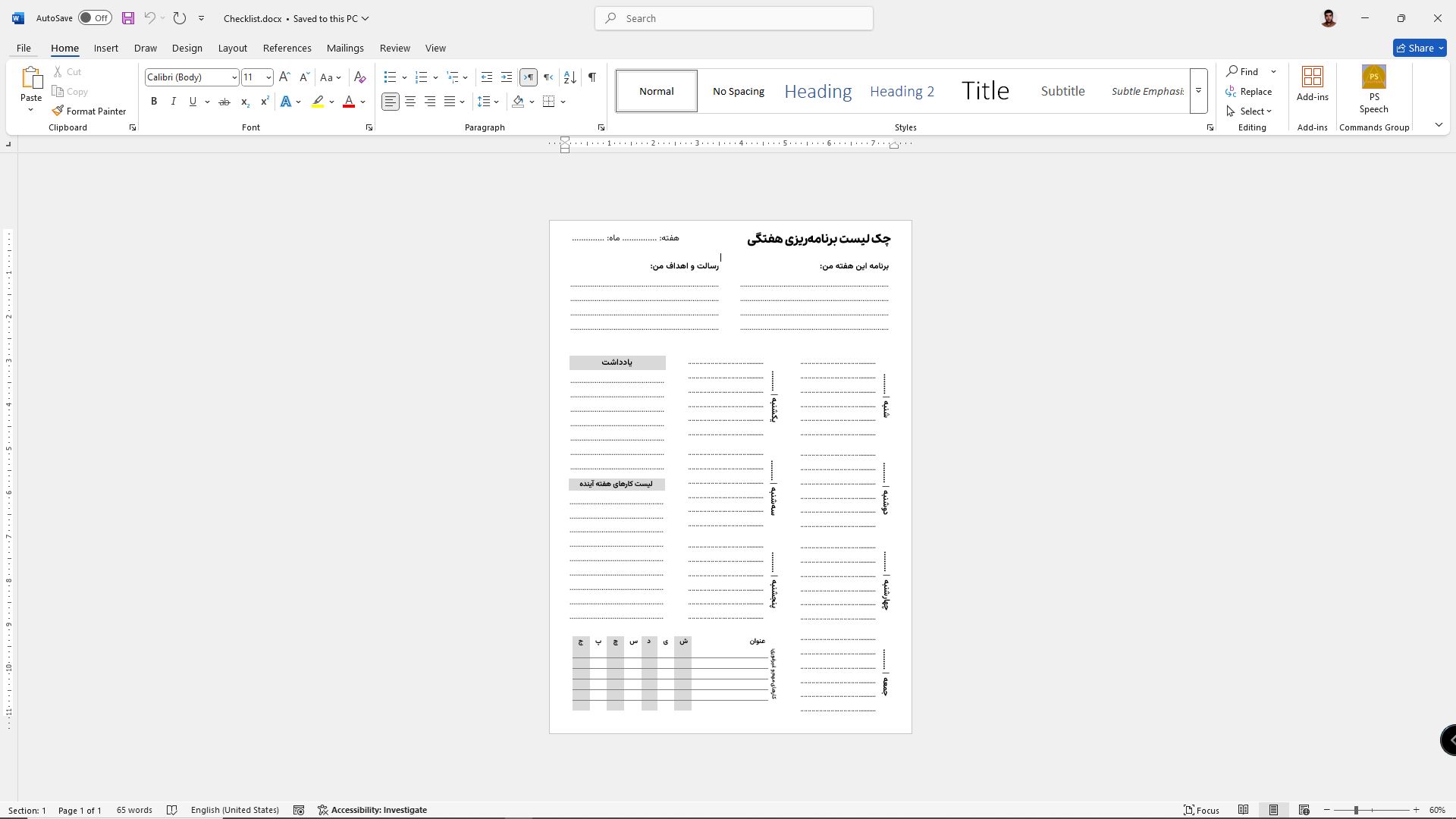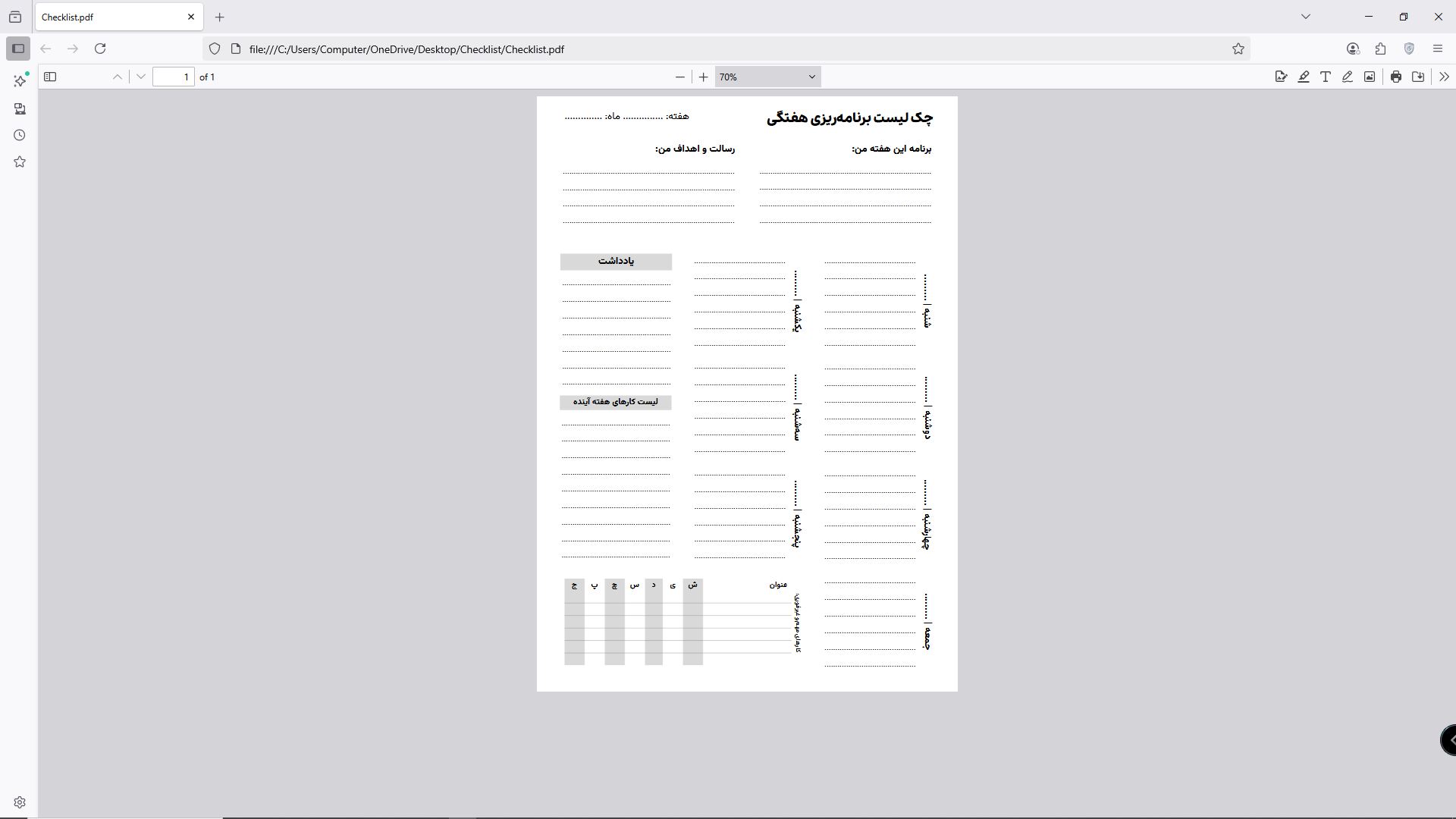 این فایل PDF یک چکلیست برنامهریزی هفتگی است که به شما کمک میکند هر هفته با تمرکز و نظم بیشتری جلو برید. در این چکلیست، بخشهای مختلفی طراحی شدهاند تا بتوانید برنامه روزانه خود را به تفکیک هر روز هفته یادداشت کنید، وظایف مهم و غیر فوری را مشخص کنید و اطمینان حاصل کنید که هیچ چیزی از قلم نمیافتد. با استفاده از این فایل، برنامهریزی برای شما سادهتر و قابل پیگیری میشود و میتوانید روند پیشرفت خود را بهتر مشاهده کنید.