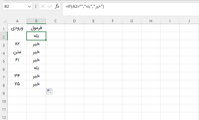 نکته: اگر سلول ورودی تنها شامل یک فاصله باشد، ممکن است ظاهراً خالی به نظر برسد. با این حال، مقدار آن دقیقاً برابر با یک رشته خالی نیست و تابع IF که پیشتر توضیح داده شد، در این حالت مقدار خیر را برمیگرداند. میتوانید از ترکیب IF و ISBLANK استفاده کنید تا همان نتیجه دقیق را دریافت کنید: