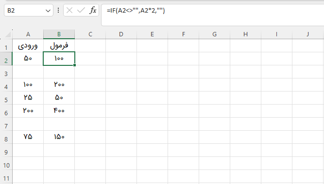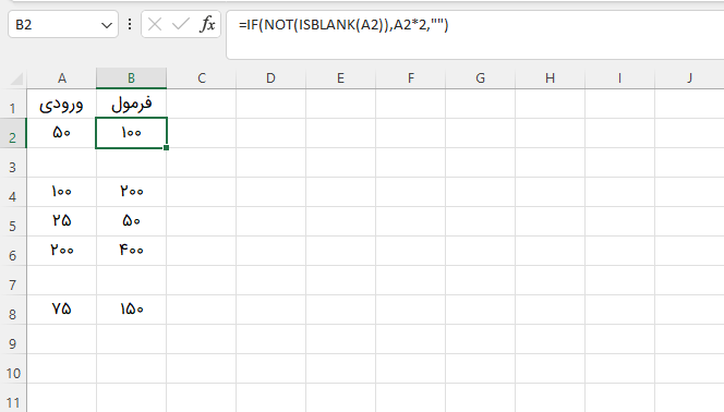 توجه: تابع ISBLANK مقدار TRUE را زمانی برمیگرداند که سلول خالی باشد و FALSE را زمانی که سلول خالی نباشد. اگر سلول ورودی شامل یک فاصله یا فرمولی باشد که یک رشته خالی تولید کند، ممکن است ظاهراً خالی به نظر برسد، اما در واقع سلول خالی نیست و فرمول بالا در این حالت مقدار خیر را برمیگرداند. اگر سلول خالی نباشد در اکسل، علامت <> به معنی «مساوی نیست» است. تابع IF زیر، مقدار ورودی را در ۲ ضرب میکند اگر مقدار ورودی برابر با یک رشته خالی نباشد (دو علامت نقلقول متوالی بدون هیچ محتوایی) و در غیر این صورت، یک رشته خالی برمیگرداند: