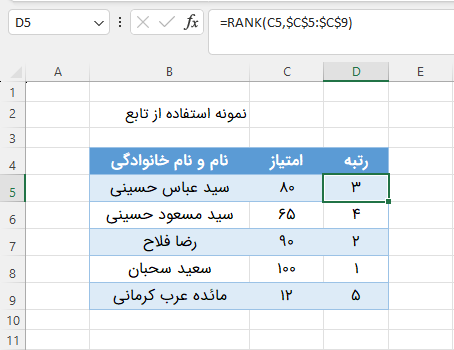 در مثال زیر، هدف تعیین رتبهٔ نمرات امتحان است. از آنجایی که برای نمرات، بیشترین نمره باید رتبهٔ اول را داشته باشد، تابع RANK به‌صورت پیش‌فرض استفاده می‌شود. فرمول مورد استفاده در سلول D5 به شکل زیر نوشته شده است:
